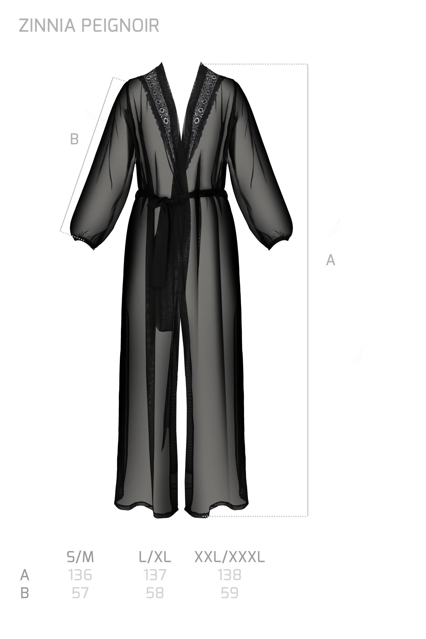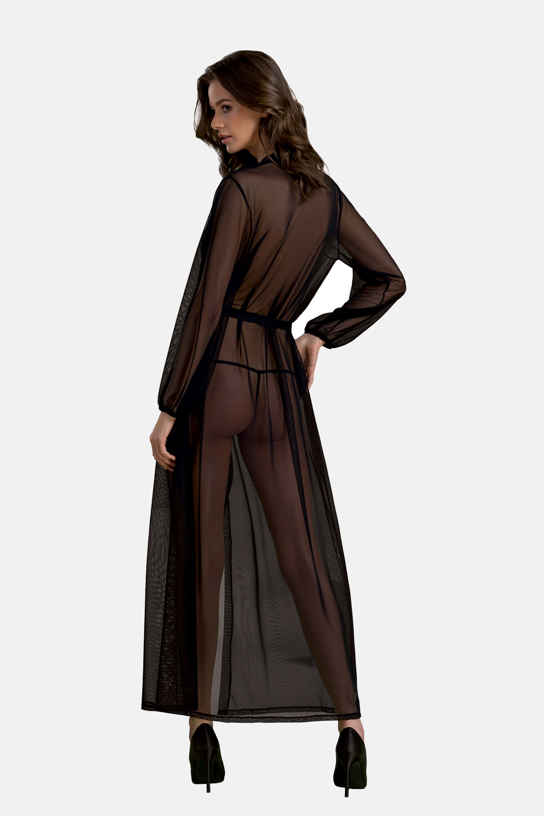 Weiterführende Links zu "Langes schwarzes Peignoir Morgenmantel mit Gürtel aus nachhaltigem Netzmaterial und Spitze langarm t"