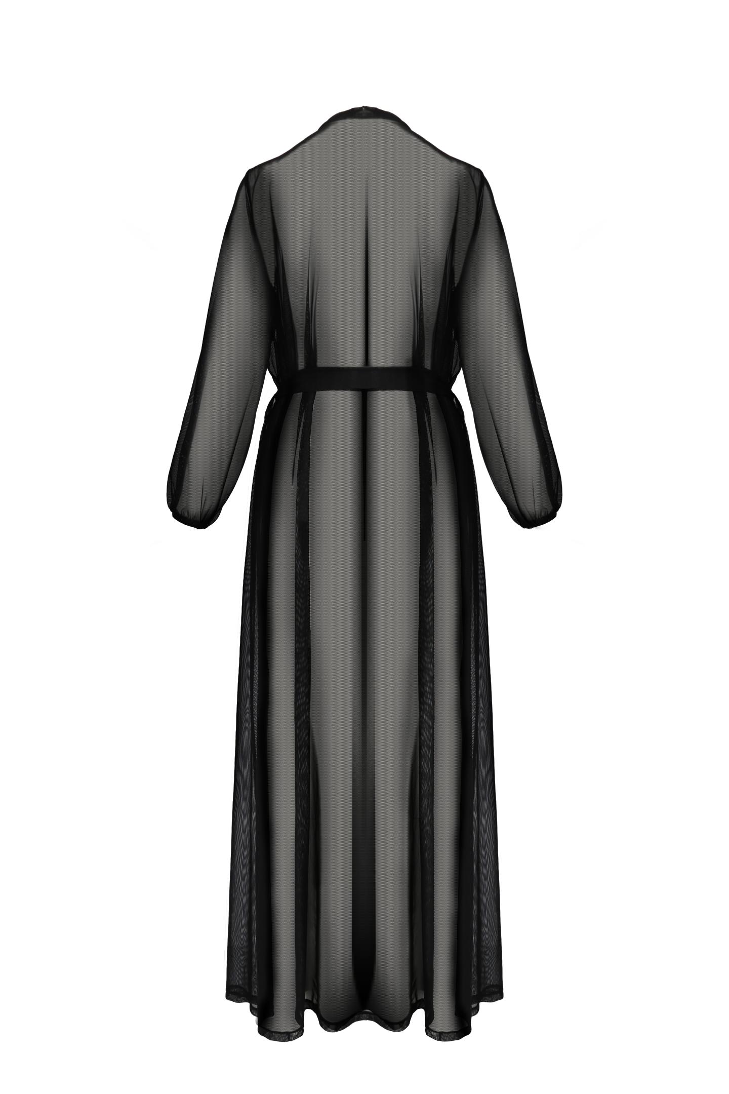 Produktinformationen "Langes schwarzes Peignoir Morgenmantel mit Gürtel aus nachhaltigem Netzmaterial und Spitze langarm t"