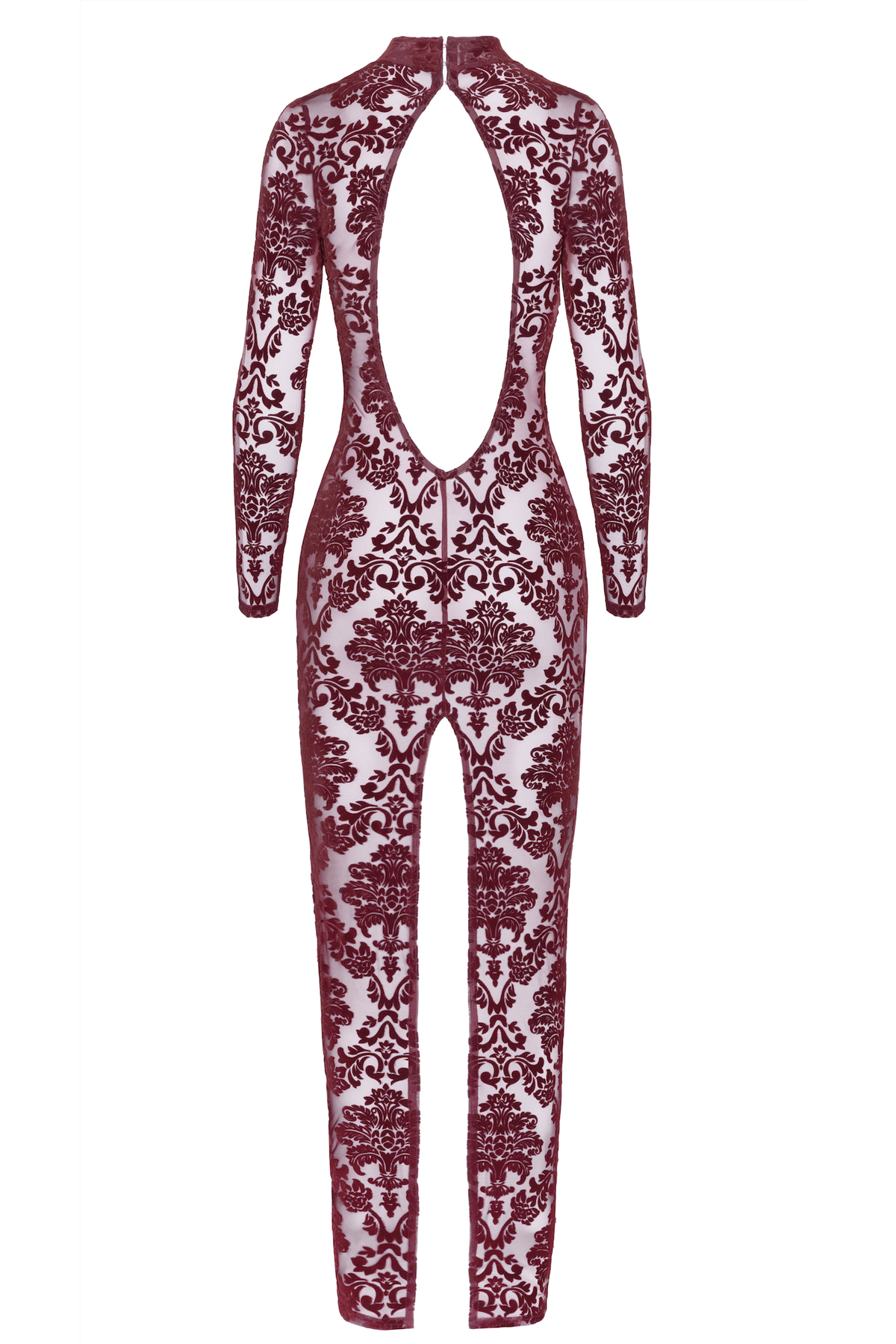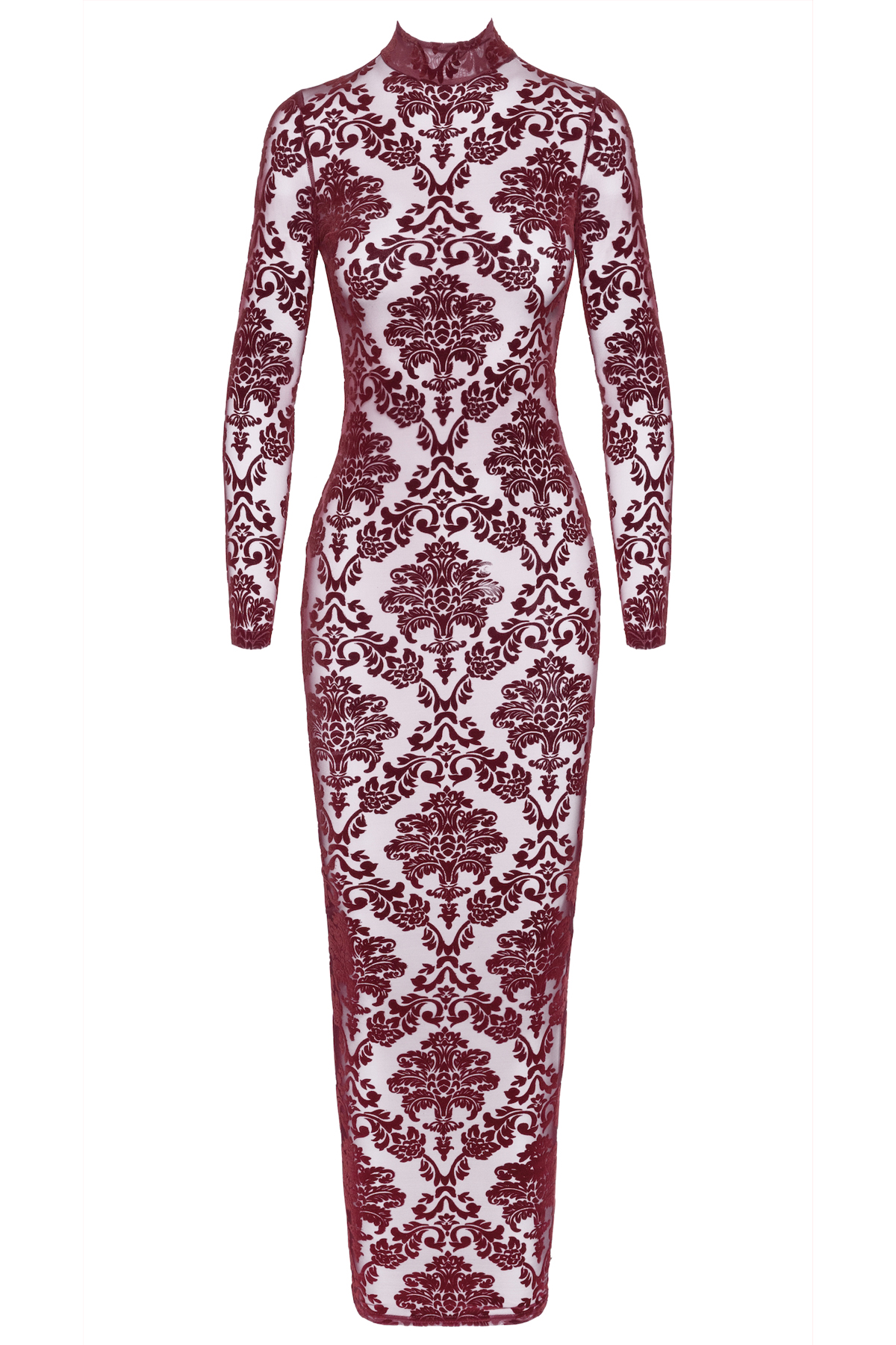 Kleid aus weichem elastischen Tüll mit Flock. Tiefer Rückenausschnitt und lange Ärmel. Tüll mit floraler Flockstickerei, tiefer Rückenausschnitt und langer Gehschlitz.Rückseitiger Hakenverschluss am Kragen. Bodenlanges Kleid. Erleben Sie zeitlose Eleganz mit diesem bodenlangen Kleid aus luxuriösem burgunderfarbenem Flocktüll, einer Neuheit der Noir-Kollektion. Das zarte, samtartige Muster verleiht einen Hauch von Raffinesse, während die langen Ärmel und der hohe Halsausschnitt eine anmutige Silhouette kreieren. Der offene Rücken bietet einen starken Kontrast und verleiht dem raffinierten Design Sinnlichkeit. Abgerundet wird das Kleid durch einen Hakenverschluss am Kragen und einen verführerischen Rückenschlitz für mühelose Bewegungsfreiheit und einen verführerischen Look. Eine atemberaubende Wahl für unvergessliche Abende.. Pflegehinweis : 30Grad Handwäsche. Farbe : rot Material : 86% Polyester / 14% Elasthan erhältliche Größen : XS - 3XL