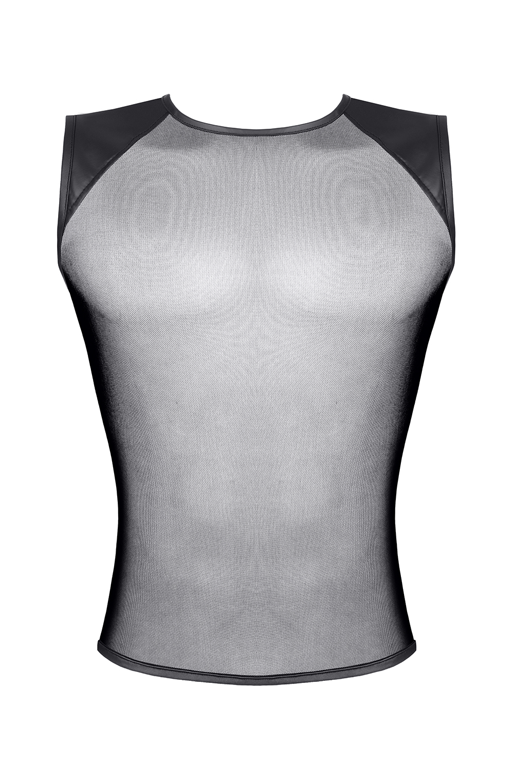 Unser Kommentar zu "Herren Shirt schwarz aus schwarzem, transparentem und elastischem Mesh Tanktop Slim-Fit Form"