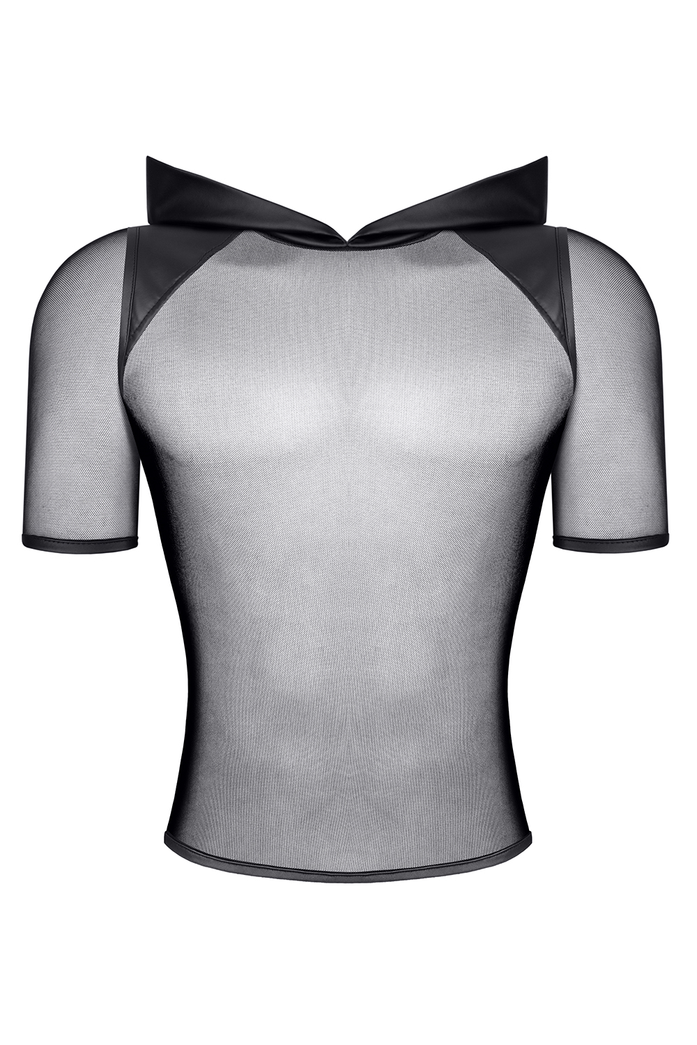 - Kurzarm Shirt aus mattem Wetlook mit Stehkragen und schwarzen transparentem Netz, dehnbarer Stoff in Slim-Fit Form. Schulter und Kapuze. Ein T-Shirt aus weichem, hochelastischem und transparentem Mesh-Gewebe, das Muskeln, Tattoos oder Piercings dezent durchscheinen lässt. Der Stoff ist extrem angenehm auf der Haut und schmiegt sich perfekt an den Körper an. Die weite Kapuze in Wetlook-Optik ist ein markantes Detail, das das gesamte Design prägt.